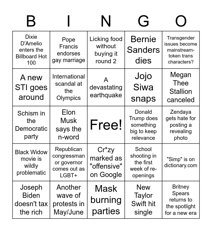 This bingo card has a free space and 24 words: Republican congressman or governor comes out as LGBT+, Another wave of protests in May/June, A devastating earthquake, Joseph Biden doesn't tax the rich, Transgender issues become mainstream- token trans characters?, Dixie D'Amelio enters the Billboard Hot 100, A new STI goes around, Pope Francis endorses gay marriage, Donald Trump does something big to keep relevance, Cr*zy marked as "offensive" on Google, Jojo Siwa snaps, Schism in the Democratic party, School shooting in the first week of re-openings, "Simp" is on dictionary.com, International scandal at the Olympics, New Taylor Swift hit single, Zendaya gets hate for posting a revealing photo, Licking food without buying it round 2, Megan Thee Stallion canceled, Elon Musk says the n-word, Britney Spears returns to the spotlight for a new era, Black Widow movie is wildly problematic, Bernie Sanders dies and Mask burning parties.