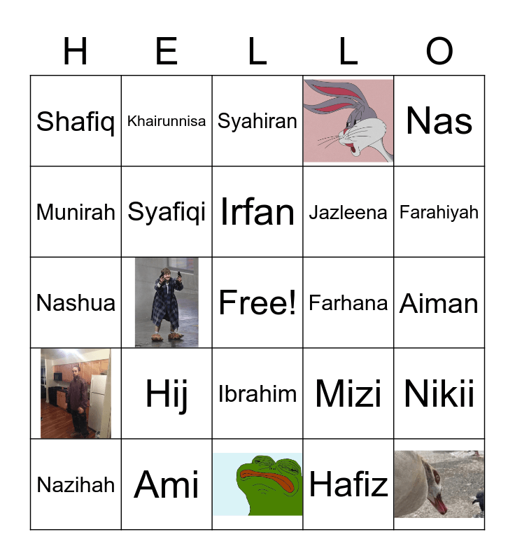 This bingo card has 5 images, a free space and 19 words: Hij, Ami, Irfan, Nazihah, Nas, Shafiq, Munirah, Khairunnisa, Farhana, Ibrahim, Jazleena, Nashua, Mizi, Nikii, Syafiqi, Hafiz, Aiman, Syahiran and Farahiyah.
