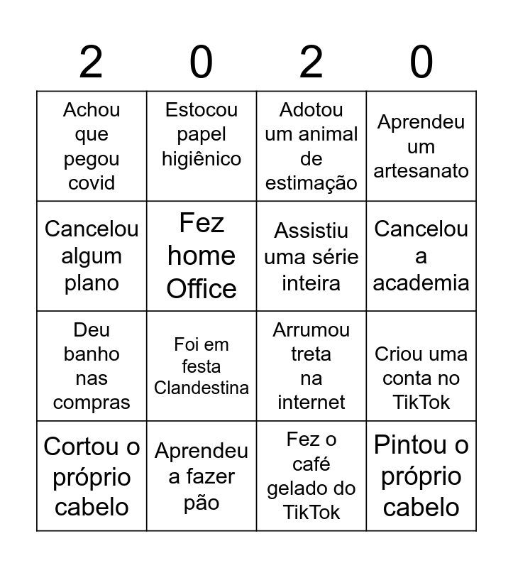 This bingo card has 16 words: Aprendeu a fazer pão, Criou uma conta no TikTok, Adotou um animal de estimação, Achou que pegou covid, Deu banho nas compras, Estocou papel higiênico, Arrumou treta na internet, Fez o café gelado do TikTok, Cancelou algum plano, Fez home Office, Cortou o próprio cabelo, Aprendeu um artesanato, Foi em festa Clandestina, Cancelou a academia, Assistiu uma série inteira and Pintou o próprio cabelo.