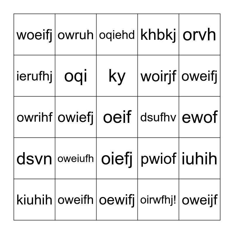 This bingo card has 30 words: oweifh, wef, owiefj, wefjlwoeijf, woeifj, oqiehd, oqi, oiefj, dsufhv, oewifj, ewof, oeif, oirwfhj!, oweijf, oweifj, lefjk, pwiof, dsvn, oweiufh, orvh, owrihf, weiurfh, owruh, woirjf, ierufhj, khbkj, iuhih, kiuhih, ky and ytdcyfr.