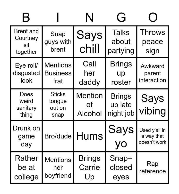 This bingo card has a free space and 24 words: Rather be at college, Bro/dude, Call her daddy, Snap= closed eyes, Throws peace sign, Brent and Courtney sit together, Snap guys with brent, Says chill, Brings up late night job, Says vibing, Does weird sanitary thing, Mentions Business frat, Says yo, Used y’all in a way that doesn’t work, Eye roll/ disgusted look, Mentions her boyfriend, Brings Carrie Up, Talks about partying, Awkward parent interaction, Drunk on game day, Sticks tongue out on snap, Hums, Brings up roster and Rap reference.