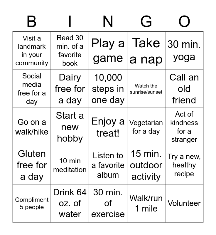 This bingo card has a free space and 24 words: 10 min meditation, Drink 64 oz. of water, 10,000 steps in one day, Compliment 5 people, 30 min. yoga, Visit a landmark in your community, Social media free for a day, Read 30 min. of a favorite book, Vegetarian for a day, Listen to a favorite album, Watch the sunrise/sunset, Go on a walk/hike, 15 min. outdoor activity, Try a new, healthy recipe, Dairy free for a day, Walk/run 1 mile, Act of kindness for a stranger, Play a game, Call an old friend, Start a new hobby, Volunteer, Gluten free for a day, Take a nap and 30 min. of exercise.
