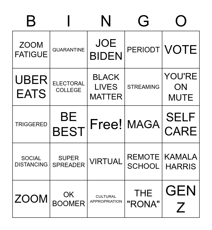 This bingo card has a free space and 34 words: WORK FROM HOME, THE "RONA", CLOWN, FACE MASK, SOCIAL DISTANCING, ELECTORAL COLLEGE, VOTE, ZOOM, QUARANTINE, LOCKDOWN, BLACK LIVES MATTER, JOE BIDEN, PANDEMIC, FAKE NEWS, MAGA, YOU'RE ON MUTE, OK BOOMER, TRIGGERED, SUPER SPREADER, REMOTE SCHOOL, VIRTUAL, CANCEL CULTURE, ZOOM FATIGUE, SELF CARE, CULTURAL APPROPRIATION, GEN Z, PERIODT, SHADE, STREAMING, UBER EATS, BLACK TWITTER, BE BEST, KAMALA HARRIS and ANTHONY FAUCI.