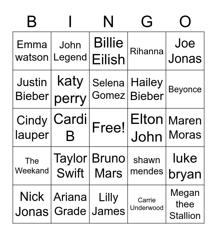 This bingo card has a free space and 24 words: Taylor Swift, Ariana Grade, Selena Gomez, Nick Jonas, Joe Jonas, Emma watson, Justin Bieber, John Legend, Elton John, Bruno Mars, Hailey Bieber, Cindy lauper, shawn mendes, luke bryan, katy perry, Carrie Underwood, Maren Moras, Billie Eilish, Beyonce, Cardi B, Megan thee Stallion, The Weekand, Rihanna and Lilly James.