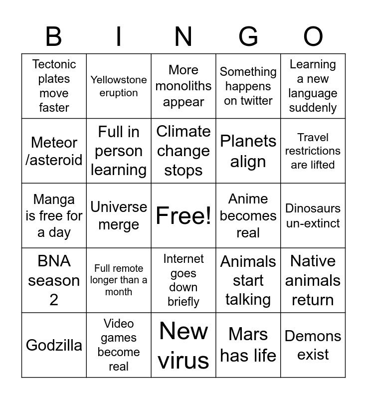 This bingo card has a free space and 29 words: Godzilla, Alien, Universe merge, Massive snow storm, Tectonic plates move faster, More monoliths appear, Full in person learning, Full remote longer than a month, Anime becomes real, Video games become real, Dinosaurs un-extinct, Demons exist, New virus, Mars has life, Travel restrictions are lifted, Superpowers, Internet goes down briefly, BNA season 2, Learning a new language suddenly, Manga is free for a day, Animals start talking, Not procrastinating, Planets align, Meteor /asteroid, Something happens on twitter, Yellowstone eruption, Native animals return, Climate change stops and Ozone is repaired.