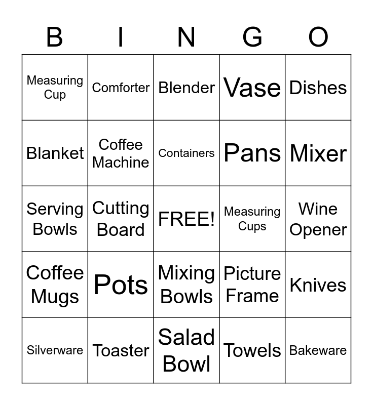 This bingo card has a free space and 34 words: Apron, Towels, Glasses, Sheets, Coffee Mugs, Coffee Machine, Dishes, Silverware, Comforter, Mezuzah, Containers, Blender, Pitcher, Salt and Pepper Shakers, Measuring Cups, Mixer, Toaster, Serving Bowls, Pots, Picture Frame, Mixing Bowls, Crockpot, Measuring Cup, Wine Opener, Salad Bowl, Bakeware, Vase, Napkin Holder, Pans, Blanket, Pillow, Cutting Board, Knives and Oven Mitts.