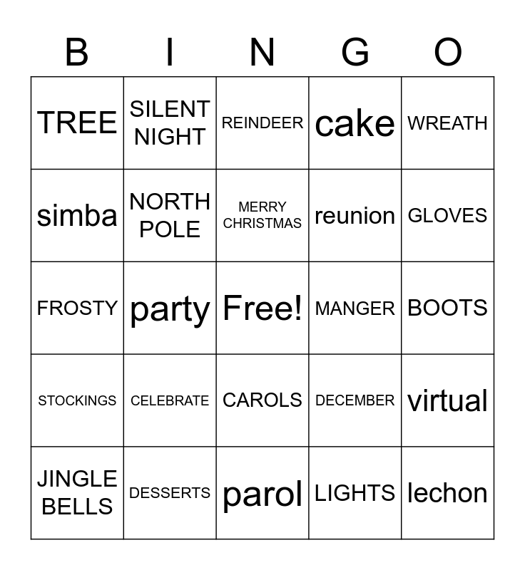 This bingo card has a free space and 34 words: CANDY CANE, LIGHTS, FAMILY, SLEIGH, STOCKINGS, NORTH POLE, WREATH, JINGLE BELLS, SILENT NIGHT, ORNAMENTS, MERRY CHRISTMAS, REINDEER, NOEL, ANGEL, MANGER, GLOVES, DESSERTS, FROSTY, CELEBRATE, DECEMBER, CAROLS, SHOPPING, TREE, BOOTS, parol, lechon, cake, friends, reunion, simba, torotot, party, virtual and face covering.