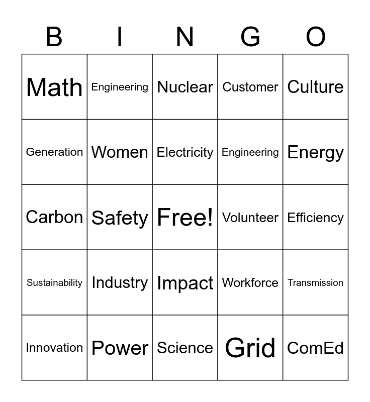 This bingo card has a free space and 31 words: Science, Career, Safety, Technology, Math, Nuclear, Women, Workforce, Volunteer, Grid, Efficiency, ComEd, Leadership, Future, Energy, Utility, Transmission, Industry, Sustainability, Impact, Culture, Climate Change, Innovation, Engineering, Engineering, Generation, Customer, Carbon, Power, Electricity and Diversity.