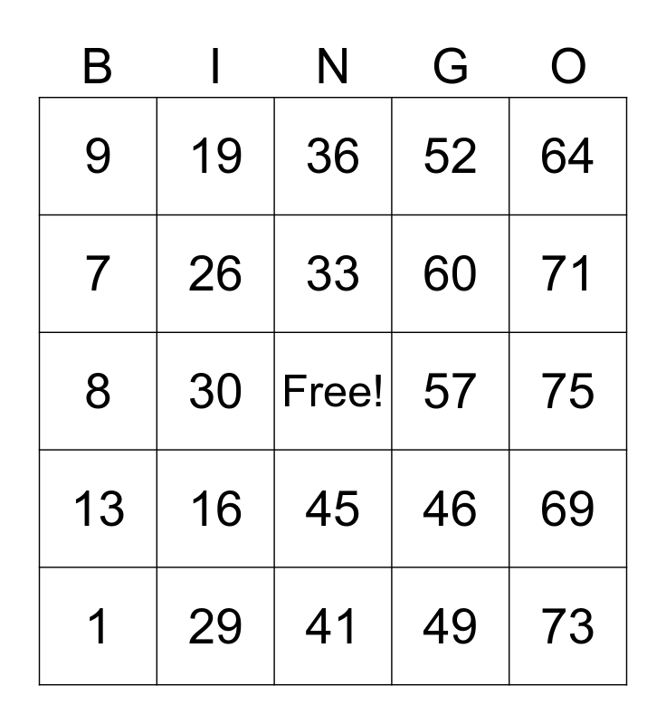 This bingo card has a free space and 24 words: 1, 16, 33, 49, 64, 9, 19, 36, 57, 75, 8, 26, 46, 69, 7, 29, 41, 52, 71, 13, 30, 45, 60 and 73.