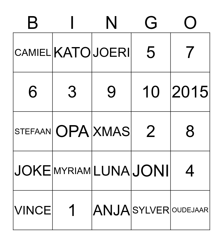 This bingo card has a free space and 24 words: MYRIAM, 1, 9, VINCE, 7, CAMIEL, 6, KATO, 2, LUNA, 10, STEFAAN, JONI, 4, 3, SYLVER, 8, JOERI, 2015, OPA, OUDEJAAR, JOKE, 5 and ANJA.
