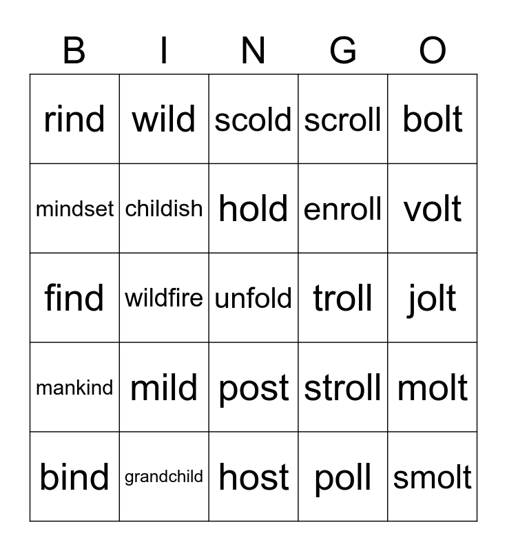 This bingo card has a free space and 24 words: bind, mild, hold, poll, bolt, rind, wild, scold, troll, jolt, find, childish, stroll, molt, mindset, grandchild, host, scroll, volt, mankind, wildfire, post, enroll and smolt.