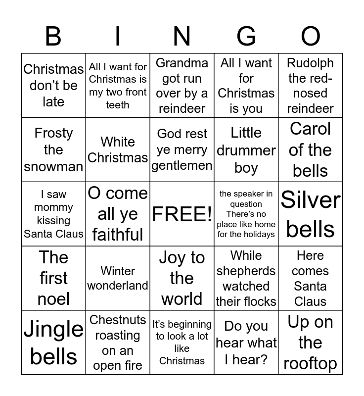 This bingo card has a free space and 24 words: Winter wonderland, Chestnuts roasting on an open fire, God rest ye merry gentlemen, Jingle bells, Rudolph the red-nosed reindeer, Christmas don’t be late, Frosty the snowman, All I want for Christmas is my two front teeth, the speaker in question There’s no place like home for the holidays, Joy to the world, Little drummer boy, I saw mommy kissing Santa Claus, While shepherds watched their flocks, Here comes Santa Claus, White Christmas, Do you hear what I hear?, Silver bells, Grandma got run over by a reindeer, Carol of the bells, O come all ye faithful, Up on the rooftop, The first noel, All I want for Christmas is you and It’s beginning to look a lot like Christmas.