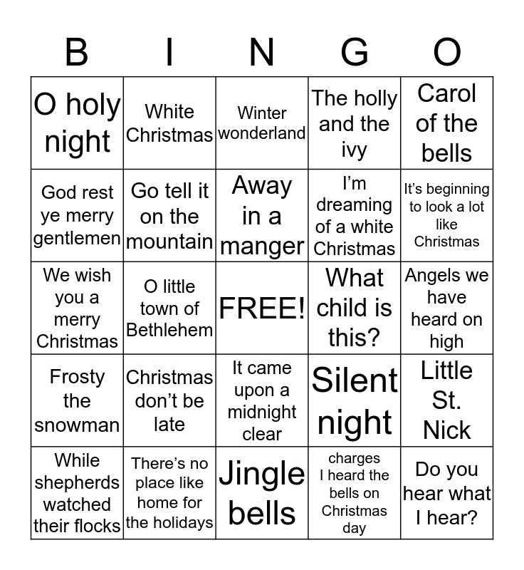 This bingo card has a free space and 24 words: Christmas don’t be late, There’s no place like home for the holidays, Away in a manger, While shepherds watched their flocks, Carol of the bells, O holy night, God rest ye merry gentlemen, White Christmas, What child is this?, It came upon a midnight clear, I’m dreaming of a white Christmas, We wish you a merry Christmas, Silent night, Little St. Nick, Go tell it on the mountain, charges I heard the bells on Christmas day, Angels we have heard on high, Winter wonderland, It’s beginning to look a lot like Christmas, O little town of Bethlehem, Do you hear what I hear?, Frosty the snowman, The holly and the ivy and Jingle bells.