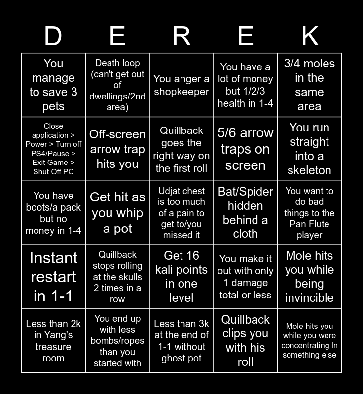 This bingo card has 25 words: Quillback stops rolling at the skulls 2 times in a row, Less than 3k at the end of 1-1 without ghost pot, Quillback goes the right way on the first roll, Less than 2k in Yang's treasure room, 3/4 moles in the same area, You manage to save 3 pets, Close application > Power > Turn off PS4/Pause > Exit Game > Shut Off PC, Death loop (can't get out of dwellings/2nd area), Bat/Spider hidden behind a cloth, Get 16 kali points in one level, 5/6 arrow traps on screen, You have boots/a pack but no money in 1-4, You make it out with only 1 damage total or less, Mole hits you while being invincible, Off-screen arrow trap hits you, Mole hits you while you were concentrating ln something else, You want to do bad things to the Pan Flute player, You anger a shopkeeper, You run straight into a skeleton, Get hit as you whip a pot, Udjat chest is too much of a pain to get to/you missed it, You end up with less bombs/ropes than you started with, Instant restart in 1-1, You have a lot of money but 1/2/3 health in 1-4 and Quillback clips you with his roll.