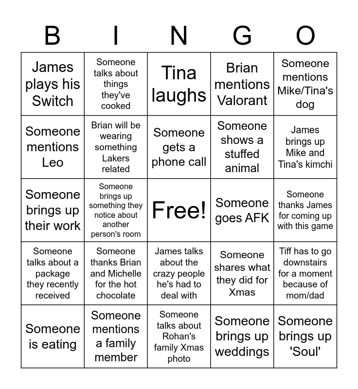 This bingo card has a free space and 24 words: Someone thanks Brian and Michelle for the hot chocolate, Someone mentions a family member, Someone gets a phone call, Someone is eating, Someone mentions Mike/Tina's dog, James plays his Switch, Someone mentions Leo, Someone talks about things they've cooked, Someone goes AFK, James talks about the crazy people he's had to deal with, Someone shows a stuffed animal, Someone brings up their work, Someone shares what they did for Xmas, Tiff has to go downstairs for a moment because of mom/dad, Brian will be wearing something Lakers related, Someone brings up weddings, Someone thanks James for coming up with this game, Tina laughs, James brings up Mike and Tina's kimchi, Someone brings up something they notice about another person's room, Someone brings up 'Soul', Someone talks about a package they recently received, Brian mentions Valorant and Someone talks about Rohan's family Xmas photo.