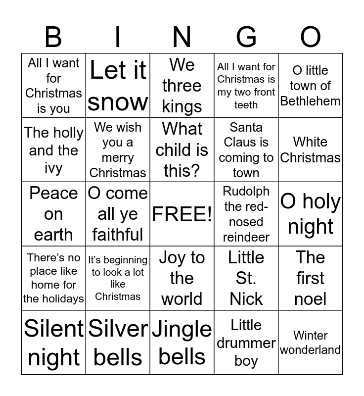 This bingo card has a free space and 24 words: It’s beginning to look a lot like Christmas, Silver bells, What child is this?, Silent night, O little town of Bethlehem, All I want for Christmas is you, The holly and the ivy, Let it snow, Rudolph the red-nosed reindeer, Joy to the world, Santa Claus is coming to town, Peace on earth, Little St. Nick, The first noel, We wish you a merry Christmas, Little drummer boy, O holy night, We three kings, White Christmas, O come all ye faithful, Winter wonderland, There’s no place like home for the holidays, All I want for Christmas is my two front teeth and Jingle bells.