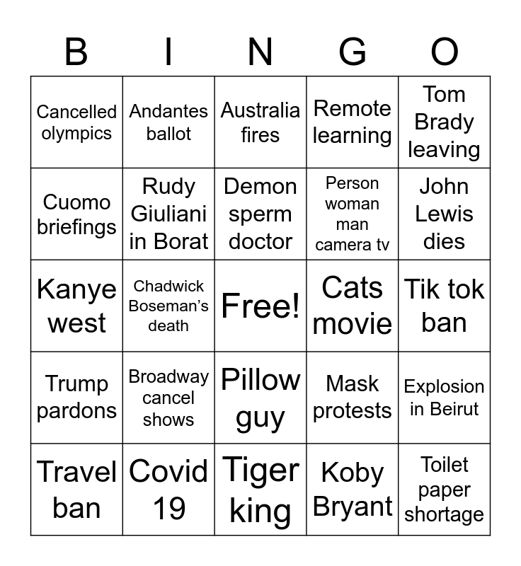This bingo card has a free space and 44 words: Murder hornets, Toilet paper shortage, Weinstein, Travel ban, Quarantine, Koby Bryant, Australia fires, Bloomberg, Tom Brady leaving, Covid 19, Remote learning, Cats movie, Pillow guy, Broadway cancel shows, Ppe shortage, Tiger king, West coast fire, Kanye west, Jk Rowling terf tweets, John Lewis dies, Andantes ballot, George Floyd, Bible pose, Cancelled olympics, RBG dies, Tik tok ban, Hydrochloroquine, Canada travel ban, Mask protests, Trump pardons, Drone strike in Baghdad, Explosion in Beirut, Royal family Megxit, Global recession, Chadwick Boseman’s death, Nashville death, Locust swarm in Africa, Bloomberg campaign, Demon sperm doctor, Cuomo briefings, Person woman man camera tv, Space force, Rudy Giuliani in Borat and UFOs.