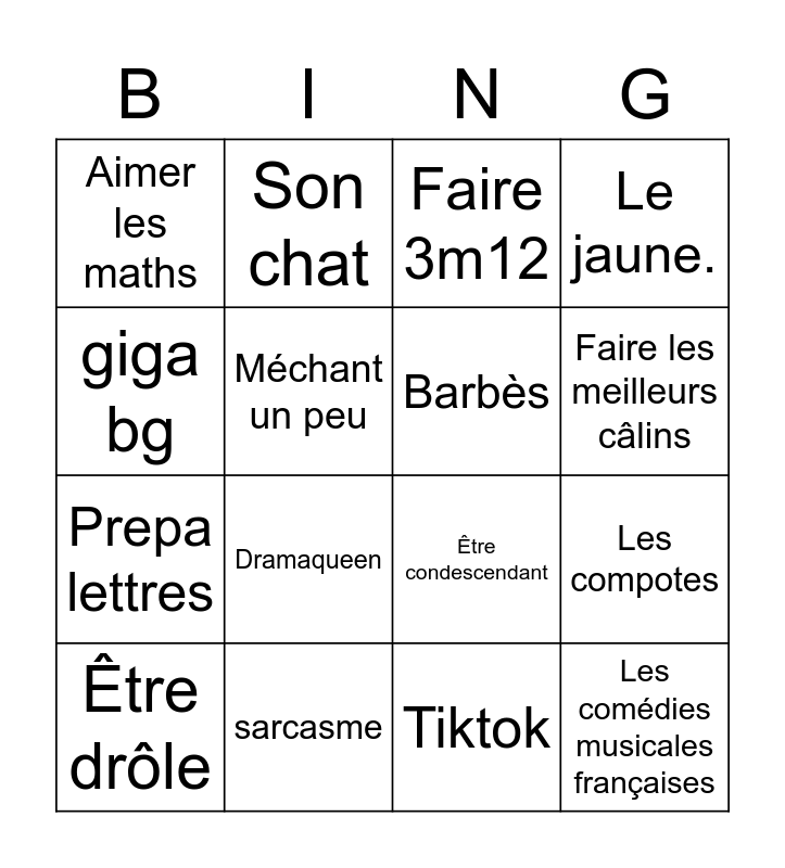 This bingo card has 16 words: sarcasme, Les compotes, Faire 3m12, Aimer les maths, Prepa lettres, Son chat, Être condescendant, Tiktok, giga bg, Méchant un peu, Être drôle, Le jaune., Dramaqueen, Faire les meilleurs câlins, Barbès and Les comédies musicales françaises.