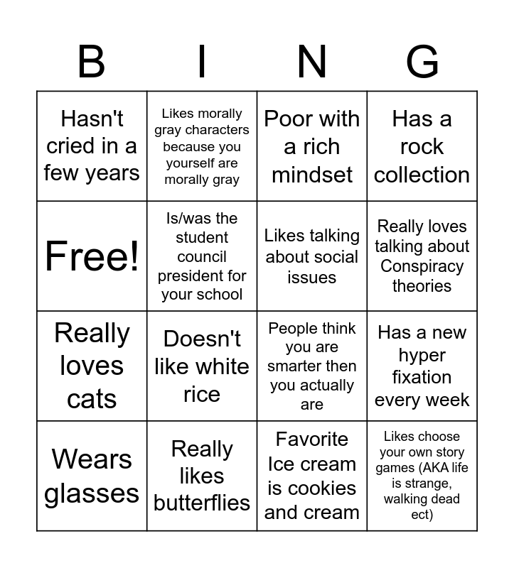 This bingo card has 16 words: Really likes butterflies, Has a new hyper fixation every week, Poor with a rich mindset, Hasn't cried in a few years, Really loves cats, Likes morally gray characters because you yourself are morally gray, People think you are smarter then you actually are, Favorite Ice cream is cookies and cream, Free!, Is/was the student council president for your school, Wears glasses, Has a rock collection, Doesn't like white rice, Really loves talking about Conspiracy theories, Likes talking about social issues and Likes choose your own story games (AKA life is strange, walking dead ect).