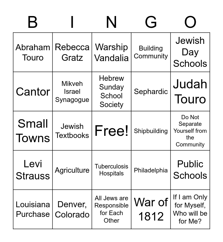 This bingo card has a free space and 34 words: Isaac Leeser, War of 1812, Uriah Phillips Levy, Westward Movement, Levi Strauss, Mikveh Israel Synagogue, Jewish Day Schools, Louisiana Purchase, Rebecca Gratz, Monticello, Hebrew Sunday School Society, Warship Vandalia, California Gold Rush, Antisemitism, Shipbuilding, Judah Touro, Denver, Colorado, Small Towns, Agriculture, Philadelphia, Tuberculosis Hospitals, Back to the Land, Abraham Touro, Do Not Separate Yourself from the Community, All Jews are Responsible for Each Other, If I am Only for Myself, Who will be for Me?, Building Community, Ashkenazic, Sephardic, Cantor, Rituals, Jewish Textbooks, Public Schools and New Bedford, Massachusetts.