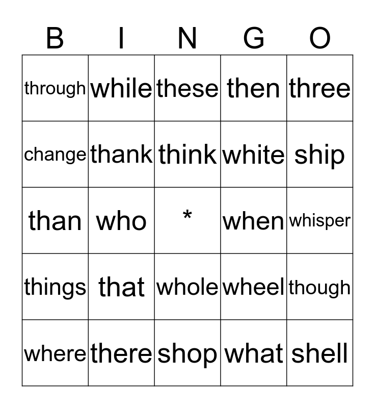 This bingo card has a free space and 24 words: that, there, think, where, three, through, change, while, when, whole, white, than, wheel, though, thank, what, whisper, these, ship, who, shell, things, then and shop.