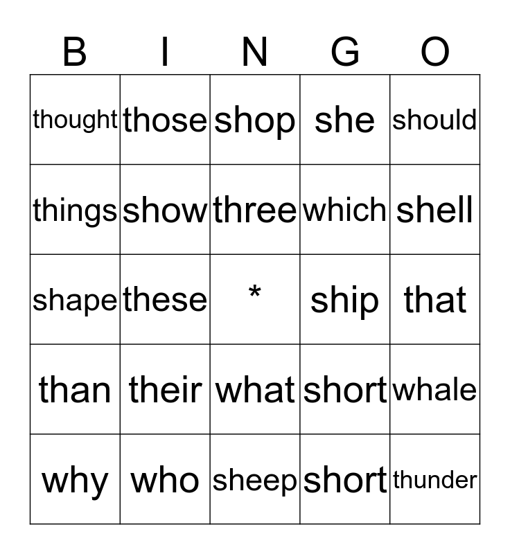 This bingo card has a free space and 24 words: their, who, three, why, should, thought, things, those, ship, what, which, shape, short, whale, show, short, that, shop, shell, these, thunder, than, she and sheep.