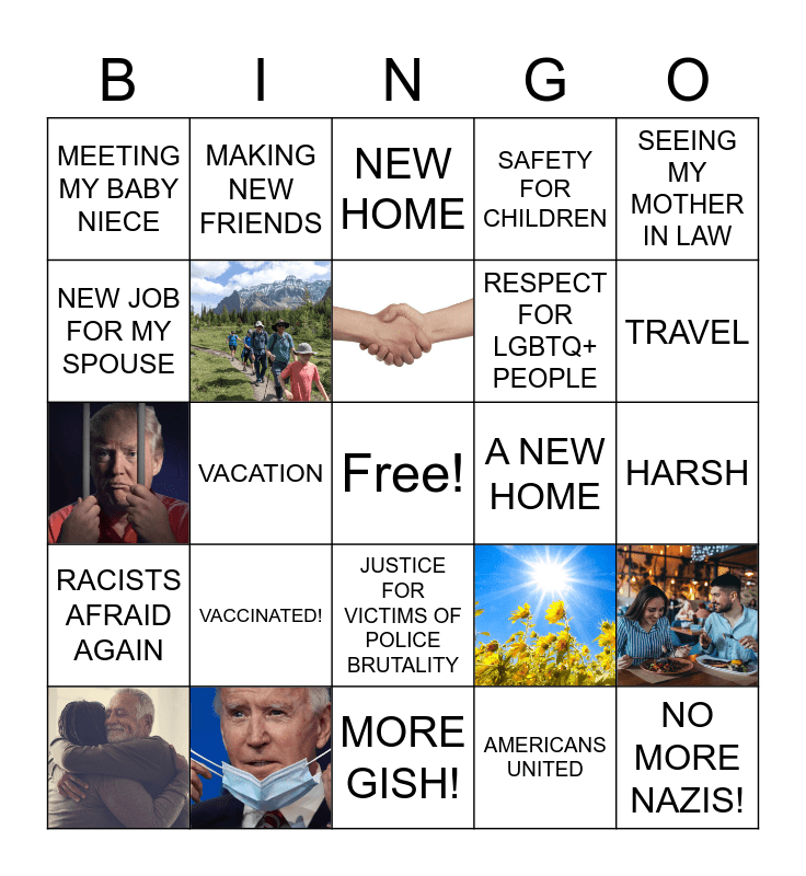 This bingo card has 7 images, a free space and 17 words: VACCINATED!, SEEING MY MOTHER IN LAW, MEETING MY BABY NIECE, NEW JOB FOR MY SPOUSE, MAKING NEW FRIENDS, A NEW HOME, JUSTICE FOR VICTIMS OF POLICE BRUTALITY, RESPECT FOR LGBTQ+ PEOPLE, AMERICANS UNITED, HARSH, NEW HOME, TRAVEL, VACATION, NO MORE NAZIS!, RACISTS AFRAID AGAIN, SAFETY FOR CHILDREN and MORE GISH!.
