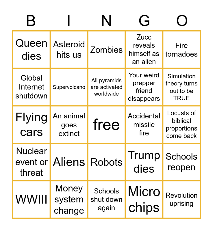 This bingo card has a free space and 24 words: WWIII, Aliens, All pyramids are activated worldwide, Micro chips, Fire tornadoes, Queen dies, Asteroid hits us, Zombies, Accidental missile fire, Locusts of biblical proportions come back, Flying cars, Supervolcano, Trump dies, Schools reopen, Global Internet shutdown, Money system change, Schools shut down again, Zucc reveals himself as an alien, Simulation theory turns out to be TRUE, Nuclear event or threat, An animal goes extinct, Robots, Your weird prepper friend disappears and Revolution uprising.