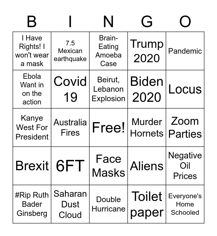 This bingo card has a free space and 32 words: Toilet paper, Tiger king, Australia Fires, Impeachment, Brexit, Covid 19, Pandemic, Negative Oil Prices, 7.5 Mexican earthquake, #Black Lives Matter, Beirut, Lebanon Explosion, Brain-Eating Amoeba Case, #Rip Kobe Bryant, No 2020 Olympics, Murder Hornets, West Coast Wildfires, #Rip Ruth Bader Ginsberg, Kanye West For President, Face Masks, 6FT, Aliens, Nevada Needs The Count, Zoom Parties, Saharan Dust Cloud, Everyone's Home Schooled, Trump 2020, Biden 2020, Ebola Want in on the action, I Have Rights! I won't wear a mask, Double Hurricane, 100,000 Duck Army! and Locus.