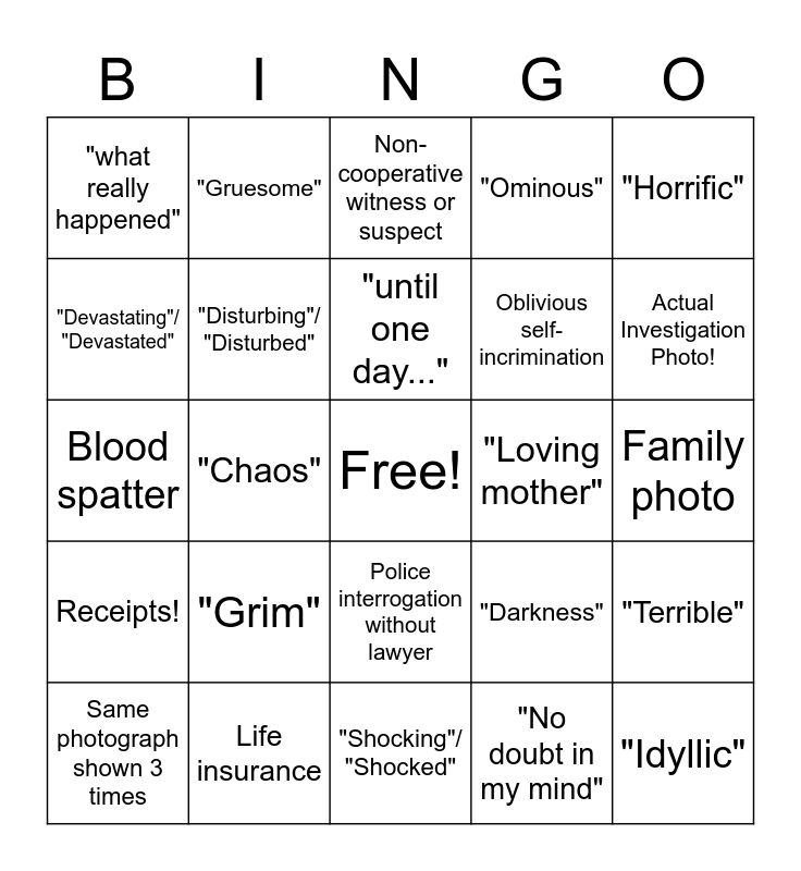 This bingo card has a free space and 49 words: "Heinous", "Idyllic", "Peaceful", "Shocking"/ "Shocked", "Grim", "Violent"/ "Violence", "Gruesome", "Harrowing", "Devastating"/ "Devastated", "Terrifying", "Disturbing"/ "Disturbed", "Ominous", "Terrible", "Darkness", "Chilling", "but then...", "until one day...", "Loving mother", "Ex-Boyfriend", "Horrific", "Chaos", "No doubt in my mind", "what really happened", Oblivious self-incrimination, Actual Investigation Footage!, Actual Investigation Photo!, Same photograph shown 3 times, Bloodthirsty relative of victim, Police interrogation without lawyer, Receipts!, Feeling sorry for those poor children, Christians!, Would never hurt anybody, A robbery gone wrong, Life insurance, Never seen anything like it, Crime scene tape, Showing cassette tape while playing audio recording, Family photo, Only one question left to answer, Stunned investigators, Someone that loved life, No history of violence, No remorse, Blood spatter, Non-cooperative witness or suspect, RKO, Spoiler mugshot! and Spoiler prison interview!.