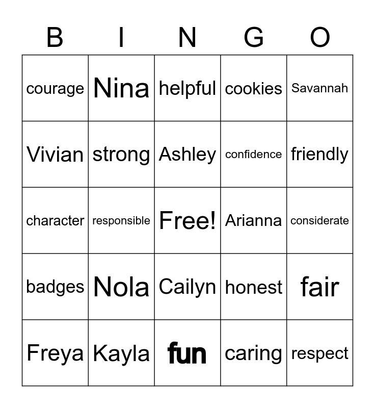 This bingo card has a free space and 24 words: Nola, Kayla, Ashley, Freya, Savannah, courage, Vivian, Nina, Arianna, Cailyn, confidence, character, honest, fair, strong, caring, considerate, helpful, friendly, responsible, respect, badges, cookies and fun.