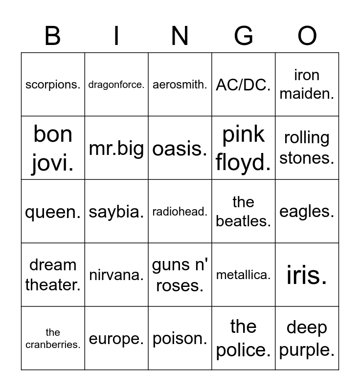 This bingo card has a free space and 24 words: nirvana., europe., oasis., the cranberries., iron maiden., scorpions., bon jovi., dragonforce., the beatles., guns n' roses., pink floyd., queen., metallica., iris., mr.big, the police., eagles., aerosmith., rolling stones., saybia., deep purple., dream theater., AC/DC. and poison..