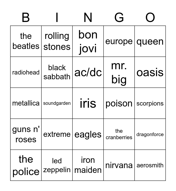 This bingo card has 26 words: guns n' roses, led zeppelin, ac/dc, nirvana, queen, the beatles, black sabbath, bon jovi, mr. big, aerosmith, radiohead, soundgarden, iron maiden, the cranberries, scorpions, pink floyd, rolling stones, eagles, europe, dragonforce, metallica, extreme, iris, poison, oasis and the police.