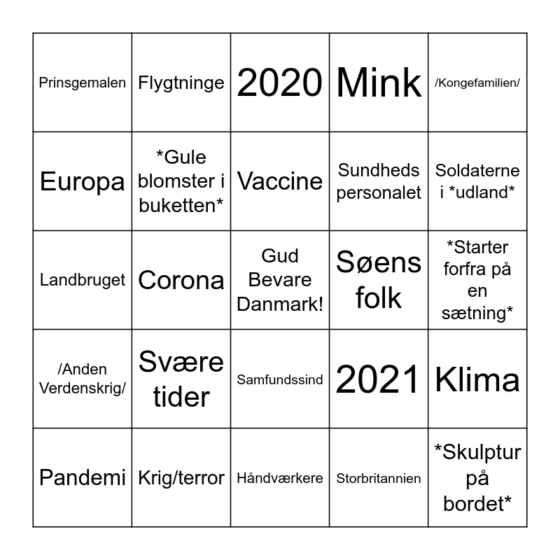 This bingo card has a free space and 36 words: Øh..., Danmark, Grønland, *Gule blomster i buketten*, 2021, /Anden Verdenskrig/, Vaccine, Ensomhed, /Kongefamilien/, Færøerne, Corona, Mink, Familie, Søens folk, Soldaterne i *udland*, Prinsgemalen, *De to store lamper på bordet*, Svære tider, *Skulptur på bordet*, 2020, *Starter forfra på en sætning*, Klima, Krig/terror, Pandemi, Håndværkere, Flygtninge, Landbruget, Forskere, Sundheds personalet, Europa, Sverige, Vores naboer, Storbritannien, Samfundssind, Fællessang and Stolt af os.