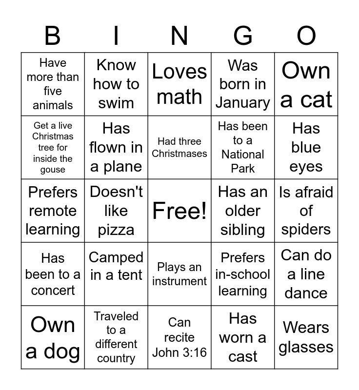 This bingo card has a free space and 24 words: Camped in a tent, Traveled to a different country, Had three Christmases, Own a dog, Own a cat, Have more than five animals, Get a live Christmas tree for inside the gouse, Know how to swim, Has an older sibling, Plays an instrument, Has been to a National Park, Prefers remote learning, Prefers in-school learning, Can do a line dance, Has flown in a plane, Has worn a cast, Is afraid of spiders, Loves math, Has blue eyes, Doesn't like pizza, Wears glasses, Has been to a concert, Was born in January and Can recite John 3:16.