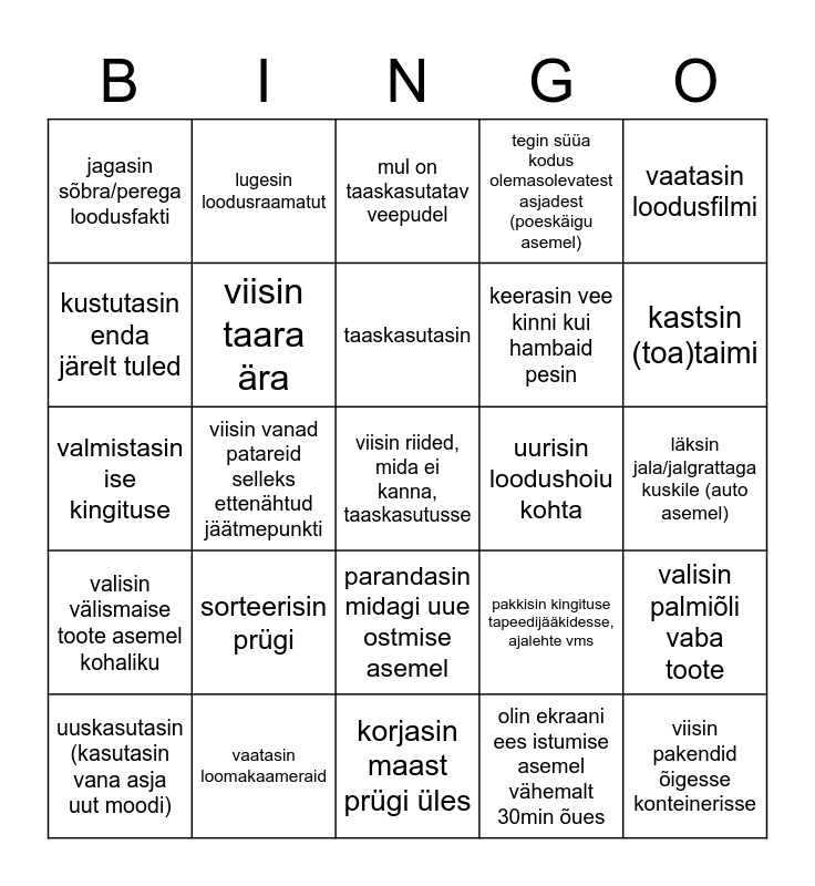 This bingo card has 25 words: sorteerisin prügi, korjasin maast prügi üles, taaskasutasin, uuskasutasin (kasutasin vana asja uut moodi), vaatasin loodusfilmi, jagasin sõbra/perega loodusfakti, kustutasin enda järelt tuled, lugesin loodusraamatut, uurisin loodushoiu kohta, parandasin midagi uue ostmise asemel, keerasin vee kinni kui hambaid pesin, valmistasin ise kingituse, pakkisin kingituse tapeedijääkidesse, ajalehte vms, valisin palmiõli vaba toote, viisin taara ära, viisin pakendid õigesse konteinerisse, läksin jala/jalgrattaga kuskile (auto asemel), mul on taaskasutatav veepudel, kastsin (toa)taimi, viisin vanad patareid selleks ettenähtud jäätmepunkti, viisin riided, mida ei kanna, taaskasutusse, vaatasin loomakaameraid, valisin välismaise toote asemel kohaliku, tegin süüa kodus olemasolevatest asjadest (poeskäigu asemel) and olin ekraani ees istumise asemel vähemalt 30min õues.