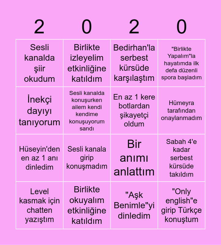 This bingo card has 16 words: Birlikte okuyalım etkinliğine katıldım, Sabah 4'e kadar serbest kürsüde takıldım, Bedirhan'la serbest kürsüde karşılaştım, Sesli kanalda şiir okudum, Hüseyin'den en az 1 anı dinledim, Birlikte izleyelim etkinliğine katıldım, Bir anımı anlattım, "Aşk Benimle"yi dinledim, İnekçi dayıyı tanıyorum, Sesli kanalda konuşurken ailem kendi kendime konuşuyorum sandı, Level kasmak için chatten yazıştım, "Birlikte Yapalım"la hayatımda ilk defa düzenli spora başladım, Sesli kanala girip konuşmadım, Hümeyra tarafından onaylanmadım, En az 1 kere botlardan şikayetçi oldum and "Only english"e girip Türkçe konuştum.