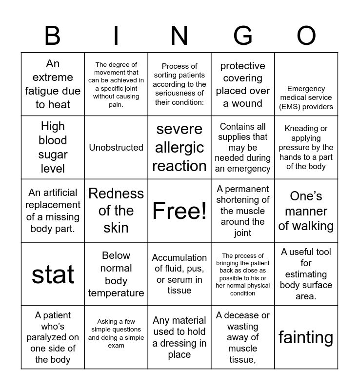 This bingo card has a free space and 24 words: Below normal body temperature, Asking a few simple questions and doing a simple exam, severe allergic reaction, A patient who’s paralyzed on one side of the body, Emergency medical service (EMS) providers, An extreme fatigue due to heat, High blood sugar level, The degree of movement that can be achieved in a specific joint without causing pain., A permanent shortening of the muscle around the joint, Accumulation of fluid, pus, or serum in tissue, Contains all supplies that may be needed during an emergency, An artificial replacement of a missing body part., The process of bringing the patient back as close as possible to his or her normal physical condition, A useful tool for estimating body surface area., Unobstructed, A decease or wasting away of muscle tissue,, One’s manner of walking, Process of sorting patients according to the seriousness of their condition:, Kneading or applying pressure by the hands to a part of the body, Redness of the skin, fainting, stat, protective covering placed over a wound and Any material used to hold a dressing in place.