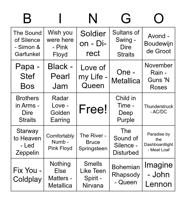 This bingo card has a free space and 34 words: Rollercoaster - Danny Vera, Bohemian Rhapsody - Queen, Piano Man - Billy Joel, Hotel California - Eagles, Starway to Heaven - Led Zeppelin, Black - Pearl Jam, Avond - Boudewijn de Groot, Fix You - Coldplay, Wish you were here - Pink Floyd, Heroes - David Bowie, Love of my Life - Queen, Soldier on - Di-rect, Purple Rain - Prince, Africa - TOTO, Child in Time - Deep Purple, November Rain - Guns 'N Roses, Nothing Else Matters - Metallica, Brothers in Arms - Dire Straits, Comfortably Numb - Pink Floyd, The Sound of Silence - Disturbed, The River - Bruce Springsteen, Oceaan - Racoon, The Sound of Silence - Simon & Garfunkel, Thunderstruck - AC/DC, Smells Like Teen Spirit - Nirvana, Imagine - John Lennon, Sultans of Swing - Dire Straits, Door de Wind - Miss Montreal, One - Metallica, Papa - Stef Bos, Just Breathe - Pink Floyd, Radar Love - Golden Earring, Paradise by the Dashboardlight - Meat Loaf and Over de Muur - Klein Orkest.