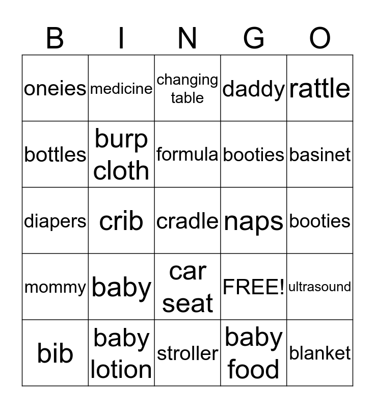 This bingo card has 25 words: baby, stroller, formula, bib, rattle, oneies, bottles, medicine, naps, car seat, booties, diapers, FREE!, ultrasound, burp cloth, blanket, booties, changing table, basinet, crib, cradle, baby lotion, mommy, daddy and baby food.