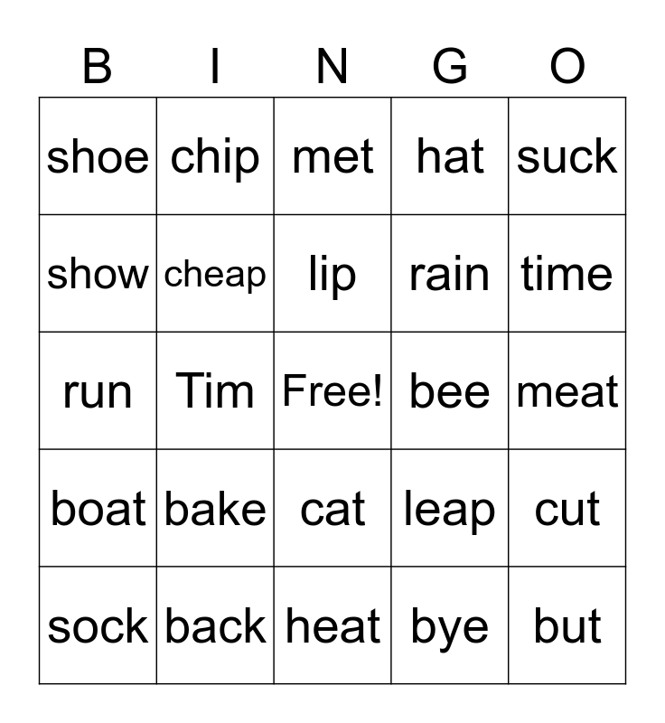 This bingo card has a free space and 24 words: bake, back, lip, sock, suck, shoe, show, chip, bee, cat, rain, run, leap, cut, cheap, bye, meat, met, time, Tim, but, boat, hat and heat.