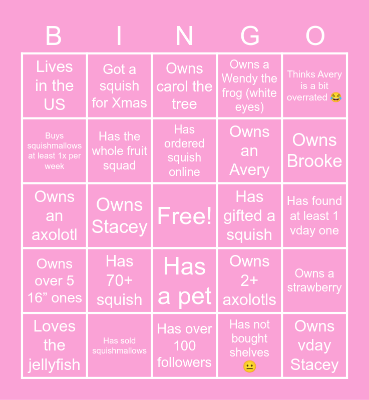 This bingo card has a free space and 24 words: Has 70+ squish, Has sold squishmallows, Has ordered squish online, Loves the jellyfish, Thinks Avery is a bit overrated 😂, Lives in the US, Buys squishmallows at least 1x per week, Got a squish for Xmas, Has gifted a squish, Has a pet, Owns an Avery, Owns an axolotl, Owns 2+ axolotls, Owns a strawberry, Has the whole fruit squad, Has not bought shelves 😐, Has found at least 1 vday one, Owns carol the tree, Owns Brooke, Owns Stacey, Owns vday Stacey, Owns over 5 16” ones, Owns a Wendy the frog (white eyes) and Has over 100 followers.