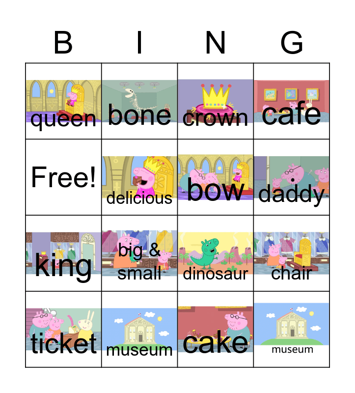 This bingo card has 15 images and 15 words: museum, chair, crown, queen, king, bone, dinosaur, cake, Free!, delicious, ticket, cafe, big & small, daddy and bow.