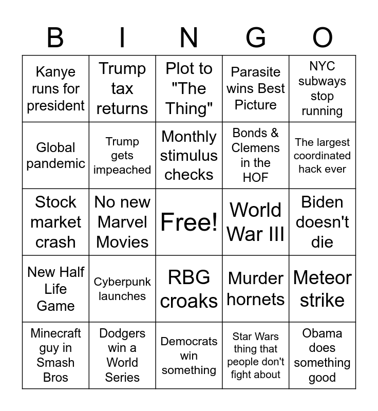 This bingo card has a free space and 24 words: Cyberpunk launches, Dodgers win a World Series, Monthly stimulus checks, Minecraft guy in Smash Bros, NYC subways stop running, Kanye runs for president, Global pandemic, Trump tax returns, World War III, RBG croaks, Bonds & Clemens in the HOF, Stock market crash, Murder hornets, Meteor strike, Trump gets impeached, Star Wars thing that people don't fight about, Biden doesn't die, Plot to "The Thing", The largest coordinated hack ever, No new Marvel Movies, Obama does something good, New Half Life Game, Parasite wins Best Picture and Democrats win something.