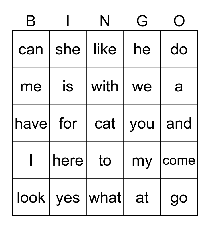 This bingo card has 29 words: look, this, for, go, can, like, is, here, you, yes, and, cat, what, at, a, the, to, I, do, have, my, see, we, me, he, she, come, with and good.