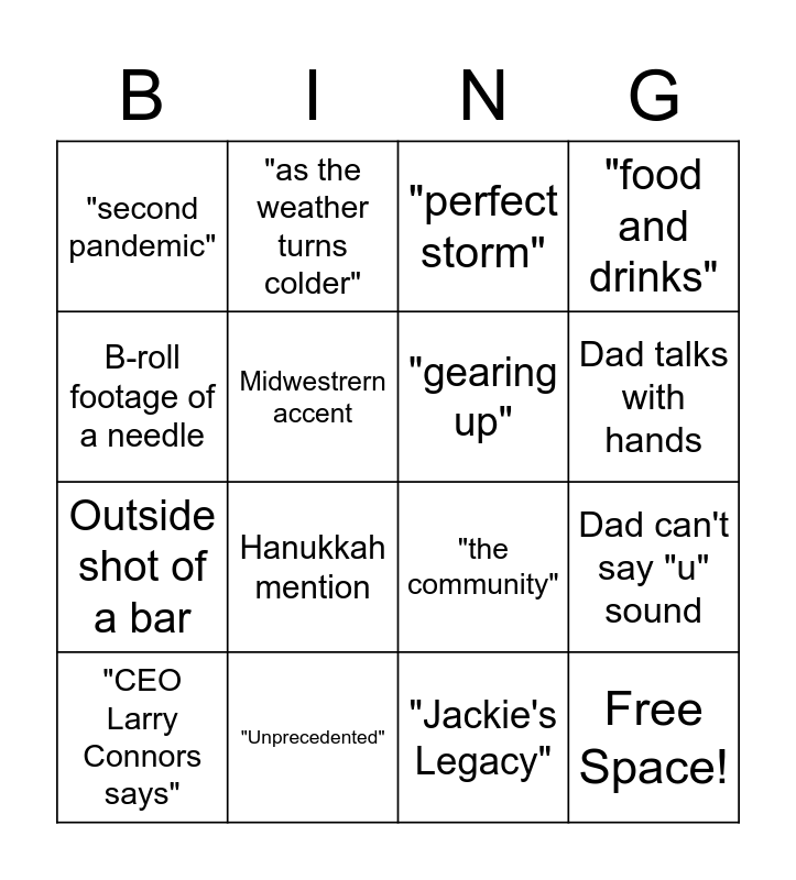 This bingo card has 16 words: "Unprecedented", Dad can't say "u" sound, "perfect storm", "second pandemic", Outside shot of a bar, "as the weather turns colder", "the community", "Jackie's Legacy", B-roll footage of a needle, Midwestrern accent, "CEO Larry Connors says", "food and drinks", Hanukkah mention, Dad talks with hands, "gearing up" and Free Space!.