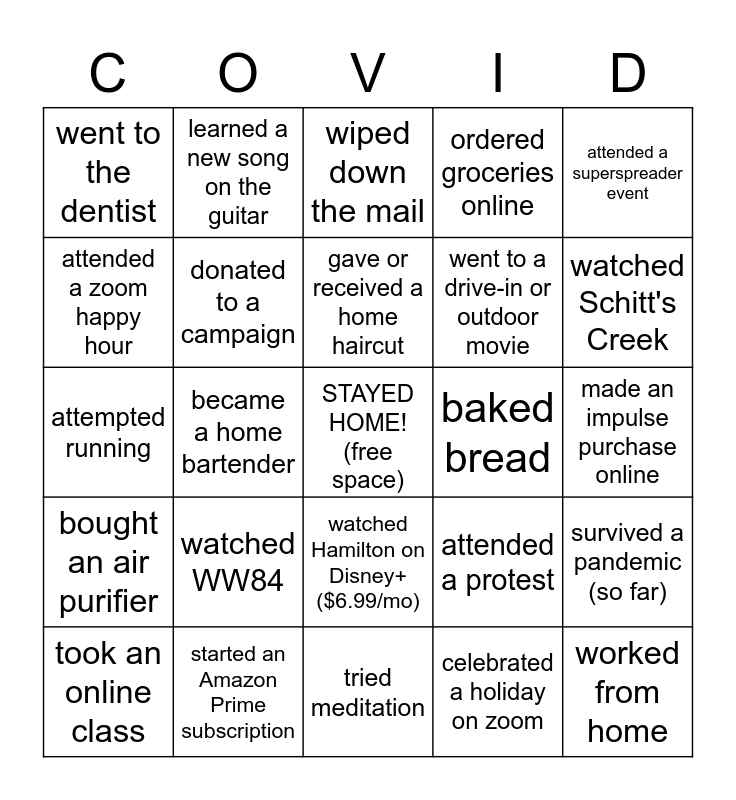 This bingo card has a free space and 44 words: canceled a trip, worked from home, forgot to mute, took an online class, watched a live show/concert online, celebrated a holiday on zoom, wiped down the mail, went for a drive, attended a superspreader event, started an Amazon Prime subscription, ordered groceries online, baked bread, watched Hamilton on Disney+ ($6.99/mo), watched WW84, voted for a republican, tried meditation, went camping, attempted running, flew on a plane, watched Schitt's Creek, learned a new song on the guitar, made a homemade meme, became exasperated with parents over covid, went to the dentist, supported a local restaurant, made an impulse purchase online, converted a room in the house to accommodate covid life, cooked a new recipe, attended a protest, bought an air purifier, thought that tickle in your throat might be covid, survived a pandemic (so far), took up a new hobby, read a book, became a home bartender, attempted home gardening, played a new board game or puzzle, read a book about race, gave or received a home haircut, attended a zoom happy hour, went to a drive-in or outdoor movie, became exasperated with parents over the elections, donated to a campaign and unsubscribed from election-related emails.