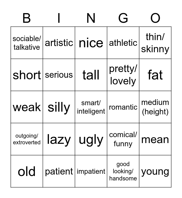 This bingo card has a free space and 29 words: old, hard-working, silly, shy/timid, sociable/ talkative, nice, serious, lazy, romantic, patient, medium (height), young, impatient, good looking/ handsome, fat, strong, ugly, outgoing/ extroverted, thin/ skinny, weak, comical/ funny, quiet, pretty/ lovely, short, athletic, artistic, mean, tall and active.