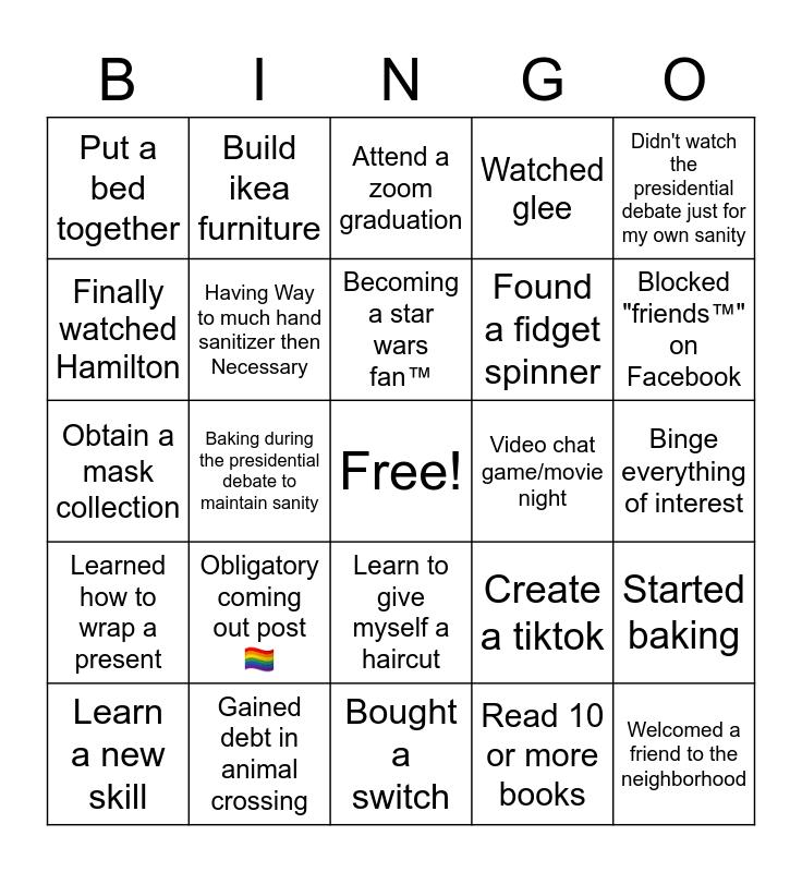 This bingo card has a free space and 24 words: Learn a new skill, Obligatory coming out post 🏳️🌈, Becoming a star wars fan™, Read 10 or more books, Didn't watch the presidential debate just for my own sanity, Put a bed together, Build ikea furniture, Attend a zoom graduation, Video chat game/movie night, Binge everything of interest, Obtain a mask collection, Having Way to much hand sanitizer then Necessary, Create a tiktok, Started baking, Finally watched Hamilton, Gained debt in animal crossing, Bought a switch, Watched glee, Blocked "friends™" on Facebook, Learned how to wrap a present, Baking during the presidential debate to maintain sanity, Learn to give myself a haircut, Found a fidget spinner and Welcomed a friend to the neighborhood.