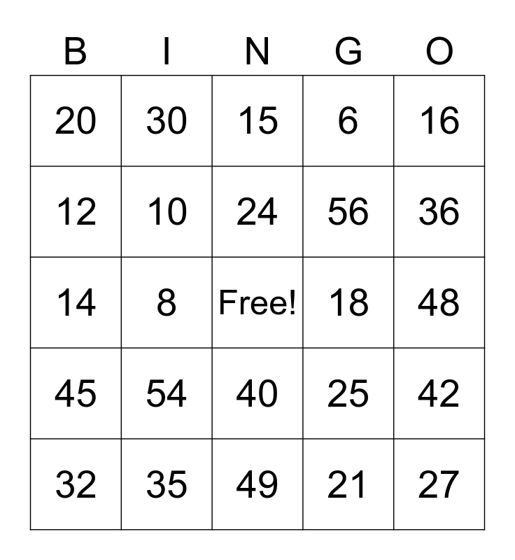 This bingo card has a free space and 24 words: 54, 35, 24, 32, 16, 20, 12, 30, 18, 40, 56, 14, 25, 42, 10, 21, 48, 15, 36, 8, 27, 45, 6 and 49.